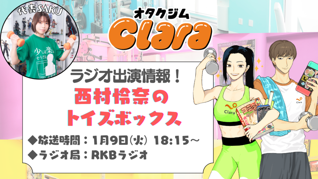 九州エリアラジオ局RKBラジオ「西村怜奈のトイズボックス」にオタクジムClara代表のSAKUが出演させていただきます!オタクジム福岡・天神スタジオをご紹介いただきます!